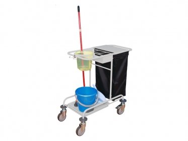 - Основные преимущества Удобство использования. Все принадлежности, моющие средства, а также мешок для сбора мусора находятся в одном месте. Ручки оснащаются резиновыми накладками, исключающими выскальзывание тележки из рук персонала во время её перемещения. В комплектацию входит многоразовый мешок для мусора с алюминиевой крышкой и съемными полиэтиленовыми вкладышами. Элемент располагается в задней части тележки, не закрывая доступ к основному инвентарю. В верхней части находится навесная полка с нишами для размещения моющих средств (не нужно наклоняться, надежная фиксация емкостей и флаконов). Тележка для уборки помещений ТУП включает в себя кольцо для размещения емкости с водой, дезинфицирующим или любым другим раствором. Нижняя платформа идеально подходит для ведра, веника, совка и других габаритных принадлежностей. Два колеса оснащены фиксаторами (для того чтобы тележка не катилась во время проведения уборки). Тележка ТКП может использоваться не только в медицинских, но и любых других учреждениях общественной направленности (офисных, образовательных, торговых, выставочных и т.д.).